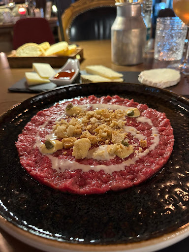 Read moreEra da tempo che volevamo venire a cena da Mosto & Carnazza… e che dire, le aspettative erano altissime. Siamo finalmente riusciti ad organizzare una serata in 4 e l’occasione non poteva che essere di quelle speciali; Il mio compleanno: mai scelta fu più azzeccata. Innanzitutto devo ringraziare Katia, la titolare insieme a Chef Andrea, la quale è stata disponibilissima ad esaudire tutte le mie richieste in merito a scelta del taglio di carne, vino e dolce (ho fatto preparare una cheesecake spaziale dal loro pasticciere). Fatta questa premessa, ecco com’è andata l’esperienza: Il ristorante è situato poco fuori dalle mura della città, risulta comunque molto centrale e facilmente raggiungibile. Non abbiamo avuto nessun problema a trovare parcheggio in zona. Arriviamo al locale e che dire, si presenta benissimo. Tutto è curato nel minimo dettaglio, dai tavoli, al mobilio… fino alle imperiose celle frigo contenenti tantissimi tagli di carne in maturazione (Dry aging). Uno spettacolo! Abbiamo cominciato l’esperienza con un antipasto a base di bresaola di Wagyu svedese (si scioglieva in bocca) e chiavennqsca. Dalla casa vengono serviti degli ottimi grissini fatti in casa con del burro… la fine del mondo. In accompagnamento abbiamo avuto degli Spritz della casa e un gin tonic al mango (scelto dalla loro lunga lista di Gin da abbinare con acqua tonica)… essendo un amante del mango non potevo non sceglierlo e… wow, buonissimo. Come portata principale ci siamo fatti preparare da Andrea un Tomahawk di Black Angus America dal peso di ca 2,5 KG (per 4). Nonostante la carne fosse molto alta, la cottura si è rivelata perfetta… si scioglieva letteralmente in bocca. Alla fine non ci è restato che attaccarci all’osso e portare a termine l’opera. La ciccia è stata ottimamente accompagnata da patate al forno, zucca e melanzane. Il mosto scelto per il banchetto è stato un Chianti classico riserva Borro (biologico) del 2019, che si è rivelato azzeccato. Come scritto in precedenza, per concludere, avevo fatto ordinare una cheesecake cotta ai frutti di bosco… che si è rivelata buonissima. In accompagnamento ci siamo fatti consigliare un vino dolce al calice, Recioto della Valpolicella, che si è rivelato gradevolissimo. Mi scuso per essermi dilungato, ma quello che è giusto è giusto. Voglio ancora ringraziare Katia per l’organizzazione e per averci accompagnato durante la serata, Andrea per la sublime carne, il pasticciere (che tra l’altro da quello che so è il figlio dei titolari) e Agnese, per la gestione impeccabile della sala. COMPLIMENTISSIMI A TUTTI. Il conto è commisurato alla qualità dell’esperienza culinaria e delle materie prime scelte. È sicuramente un indirizzo per molti ma non per tutti (per una questione unicamente economica), PERÒ crea altamente dipendenza, al punto che tra il 03.12.2023 al 11.01.2024, in meno di un mese e mezzo siamo già stati 3 volte :-). A mio modestissimo parere, un ristorante unico nel comasco; se cercate della carne di ottima qualità, accompagnata da una carta dei vini di livello, con un servizio impeccabile, beh, non dovete far altro che chiamare e...