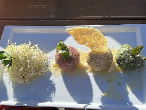 Baita el Brodol on the pistes near Canazei is a fabulous restaurant (with lots of flags on the outside - hard to miss) has a cozy, rustic atmosphere, with warm decor and plenty of outdoor seating. A menu must-have is their trio of Knodel, a classic Tyrolean dish made with three different types of dumplings. The knodel are expertly made, with a light and fluffy texture and a rich, savory, cheesy flavor. They are a perfect complement to the restaurant's hearty, warming dishes, making for a truly satisfying meal.