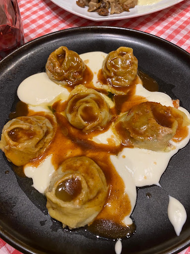 Il personale di sala si è dimostrato estremamente cortese e disponibile, fornendoci dettagliate spiegazioni sui piatti e le specialità del giorno. Abbiamo optato per i tortelli ripieni di capriolo, accompagnati da una deliziosa fonduta di formaggio Puzzone di Moena, e per il piatto Ostaria, composto da gulasch di cervo, polenta, formaggio fuso e funghi. Per concludere in dolcezza, abbiamo gustato una deliziosa mousse di cioccolato bianco e frutto della passione servita con mandorle e miele.