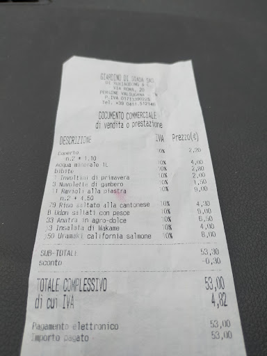 Read moreLocale carino stile orientale con il personale abbinato alla loro tradizione. Precisando che siamo andati a cenare la sera di capodanno 2018/2019 era molto affollato, per cui non sò se sia stata un scelta o il loro stile, ma i posti erano molto vicini e si stava stretti per 2 persone e un bambino. La qualità del cibo non era male, ma il rapporto qualità prezzo lascia un pò a desiderare, poichè le porzioni dei piatti erano veramente scarse. Siamo usciti dal locale con la fame e l'amaro in bocca per aver speso 63 euro ed essere ancora affamati per aver mangiato: 3 porzioni di ravioli al vapore. 2 Primi Riso con verdure/ Spaghetti di soia con verdure piatto unico per 2 persone Secondi: 2 porzioni di pollo alle mandorle/pollo funghi e bambù piatto unico per 2 persone. Dolci e caffè: 3 gelati fritti + un macchiatone lasciato li (troppo amaro) Bere due coche in lattina + 1 litro di acqua frizzante P.S Nel menù c'era scritto (a capodanno 15% di sconto) Quindi senza il 15% quanto avrei pagato di conto finale?