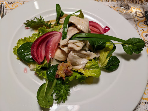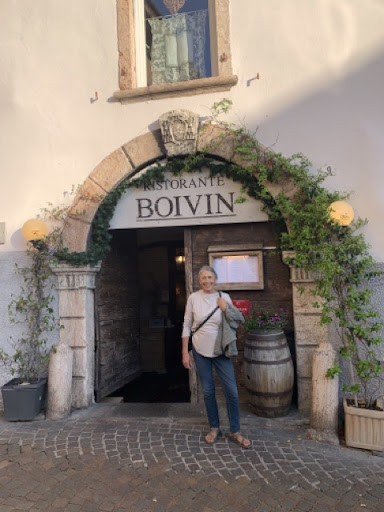 I couldn’t love this restaurant more, including the absolutely kind, talented, curious, generous chef, Riccardo. From the start, the setting, in an old lofty cellar, is transporting. Then, the décor! I especially loved the hand embroidered napkins that are placed over the lights as though lamp shades! We ordered the tasting menu because a friend had told me this place was the real deal. And she was right! It was a hit parade, from the fresh goat’s milk ricotta to the cured trout with celeriac salad to the pappardelle with ragu which had the best texture of any pasta I had during my entire trip to Italy. (As I like to say, the pasta talked back between my teeth.) It was a lot of food so come hungry, but having had a few other tasting menus before, it wasn’t as intense and uncomfortably filling as it could have been. The sommelier also knocked it out of the park with wine pairings and my favorite: the storytelling about the wine. This is a meal I won’t...
