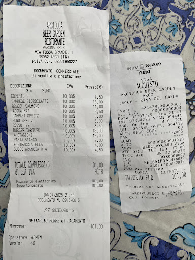 Read moreARCIDUCA Beer Garden e Ristorante offers a mixed experience. On one hand, the atmosphere of the beer garden is quite inviting, especially during warm summer evenings. The selection of craft beers is impressive, and the Italian dishes are well-prepared, showcasing fresh ingredients and authentic flavors. The setting is perfect for a relaxed evening with friends or a casual dinner, providing a pleasant backdrop with its charming garden ambiance.