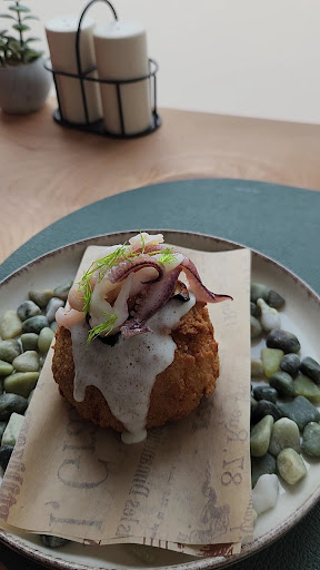The food was amazing we had both of the Fried plates on the menu for lunch(we came back for dinner), Seafood Paella Arancini's and chicken filled with cheese (can't recall the name) and chili flakes, both fried to perfection, amazing control of oil temperatures, dry on the outside, soft creamy, juicy on the inside, the Arancini's rich flavor, savory sauce and tangy hit of seared lemon slice is so we'll thought as a dish, the fried chicken was well seasoned, not to hot but you can taste the chili, the outer crust made with what appeared plain corn flakes, very crunchy, not oily at all and golden brown (corn flakes can burn easily and quick at high temps), amazing stuff. For dinner we had Calamari and Korean style fried chicken, the Calamari were cooked as they should, just right, no chewyness, no hard parts, a bit of chimichurri on top to give it the tangyness seafood shines the best with, a really nice sauce to compliment it and seasonal vegetables to accompany (leek in this case) seared served with salt flakes on top, the Korean style fried chicken i can't really comment that much because i just tried a bit, but it was good!, we had dessert and ordered their cheesecake with applesauce, i loved that the applesauce wasn't sweet because the cheesecake it self had enough sweetness already, it's texture was not what I'm used to, it was a little bit lighter, fluffier you might say, and i actually prefer this to the more solid and heavy kind of texture. The service was great, very friendly, food was served hot, fresh and fast, good teamwork and flow. The atmosphere was cool to, the place smells amazing and it's not even the food yet, is the wooden smell from the tables, is subtle but very nice and fragrant, and you can eat looking at Arco's Castle, an amazing view. 10/10...