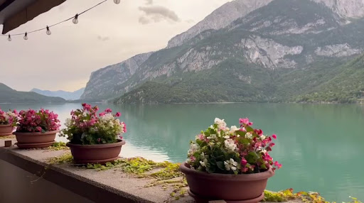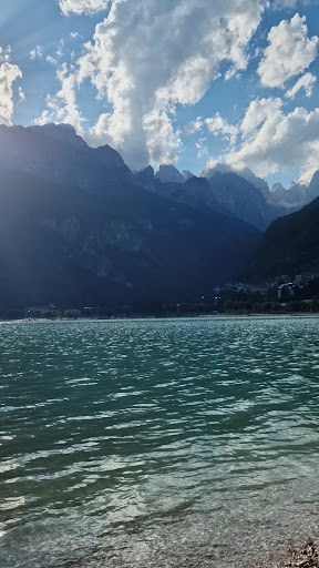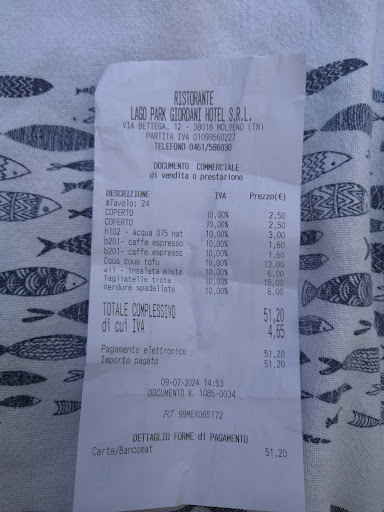 Bellissimo posto vista lago di Molveno e monti del Brenta. Abbiamo mangiato in due: un cous cous (nel menù inserito tra gli antipasti), un piatto di tagliatelle al sugo di trota, due contorni (un insalata e delle "verdure" saltate), acqua, due caffè lisci. Nelle tagliatelle, peraltro molto buone, ho trovato, attaccati ad una fetta di mela essiccata, dei chicchi di riso cotti. Ho segnalato la cosa alla cameriera che si è allontanata per segnalare l'accaduto ed è tornata scusandosi per la cosa è chiedendo se desiderassi dell'altro. Ho risposto in modo negativo, a quel punto avevo già mangiato metà piatto prima di accorgermene. Il resto del pranzo è proseguito senza particolari sorprese; segnalo, tuttavia, che la porzione di verdure saltate era molto scarsa e consisteva in piccoli cubetti di verdure in padella nonostante il costo di 6 €.