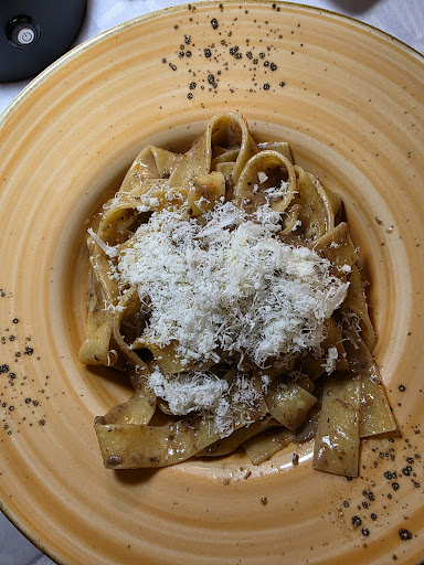 Read moreTagliere di affettati e formaggi per due appoggiato lì in mezzo al tavolo senza perdere mezzo minuto per dirci che salumi erano, prodotti dove, formaggi fatti con latte di mucca, di capra, di pecora? due parole di contesto, niente! In un ristorante di un paesino che si fonda sul turismo è vergognoso che non si valorizzino i prodotti tipici. Viene ovviamente il dubbio che non vengano valorizzati perché di tipico e di artigianale avessero ben poco (per fugare ogni sospetto bastava perdere un minuto con i tuoi unici clienti per descrivere cosa gli stai servendo). Seguono Tagliatelle ai funghi, con i funghi completamente spappolati che diventano una sorta di poltiglia (comportamento tipico da fungo surgelato…) eccessivamente salata. Visto l’andazzo non ho motivi per non temere che fossero surgelate anche le tagliatelle, per altro arrivate istantaneamente dopo aver ritirato il tagliere, dunque già pronte da più di qualche minuto… Quale che fosse l’origine dei prodotti, sapori da menu turistico. Giovane cameriere che porta i primi senza dire cosa sta appoggiando al tavolo né a chi siano destinati e pretende inoltre di ritirare i piatti ad un commensale mentre l’altro sta ancora finendo di mangiare, per di più chiedendo se si gradiva un caffè e il dolce. In un posto dove non serve investire per far arrivare i clienti, trovandosi al centro di un posto con una grande e naturale affluenza di turisti, mi aspettavo una maggiore dedizione verso i prodotti del posto, con una narrazione più curata sulla gastronomia locale. Si esce con l’idea che si tratti di un posto che avrà sempre clienti sufficienti per vivere appena sopra la soglia della sopravvivenza e questo tutto...