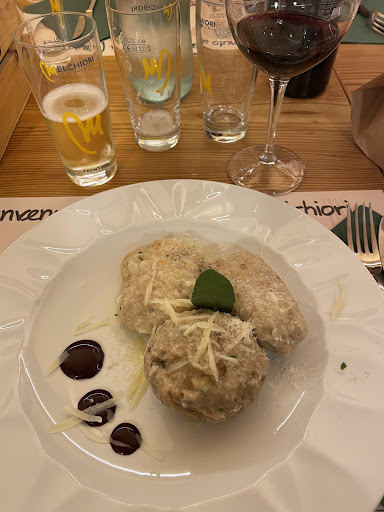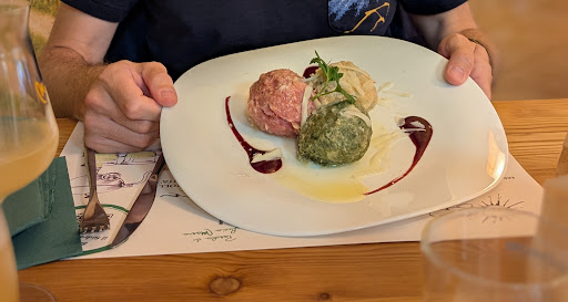 Ambiente molto carino con arredamento in legno tipico della zona ma con taglio moderno. Siamo stati incuriositi dalle recensioni positive e dalla vasta gamma di sidro di mele disponibili, di cui abbiamo assaggiato diverse varianti, e ci siamo fermati per la cena (nota dolente del posto). Locale parecchio affollato con poco personale a gestire le due sale, di cui 2 camerieri non particolarmente sul pezzo: Dopo aver ordinato sono passati circa 20 minuti prima che ci venisse ritirata la comanda dal tavolo (probabilmente perché persa quella in cucina) e altrettanto tempo per la consegna dei piatti, con parecchie difficoltà da parte del personale nell'individuazione dei tavoli corretti a cui erano assegnate le pietanze. Su 7 piatti principali ordinati, 1 è stato richiesto due volte ed è arrivato quando ormai tutti gli altri commensali avevano terminato di mangiare. Ultimo episodio che ci ha lasciati con l'amaro in bocca: alla nostra richiesta dello strudel di mele come dolce in menù, ci è stato risposto che veniva chiesto da tutti ma che era terminato da due giorni, quindi decidiamo di passare direttamente ai caffè per terminare al più presto la difficile esperienza. Visto il servizio, le tempistiche e la qualità del cibo discutibili (estremamente intriso di burro fuso/olio, tanto da risultare pesante) non ci riteniamo per nulla soddisfatti. Sicuramente non torneremo, anche se il locale ha del potenziale, avendo anche uno shop ben fornito di sidro e prodotti locali direttamente all'ingresso della...