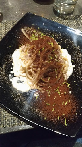 Read moreLocation strana, minimale ma pretenziosa. Grande difficoltà per trovare un parcheggio. Menù limitato ma potrebbe starci attesa l'ambizione dei gestori di fare poche cose ma fatte bene. Peccato che il menù degustazione proposto (affettati misti con assaggio di formaggi, cacio e pepe ed amatriciana, stracotto al marzemino, dolci della casa) sia stato interlocutorio e non privo di contraddizioni. Antipasto passabile con qualche lacuna per l'accostamento e la qualità dei prodotti, non tutti di buona qualità. Cacio e pepe, cremoso e piacevole ma troppo carico di formaggio e non proprio tutto pecorino romano. Amatriciana incommentabile, saltata nella padella del cacio e pepe (il sapore di formaggio del piatto precedente era predominante) con pomodoro di barattolo crudo frullato (sic!) con uno strano sapore (il gestore ha detto che si tratta di una grattata di zenzero .... Mah!....ma che c'azzecca?) e due striscioline di pancetta croccante a decorazione del piatto (secondo il gestore guanciale, sic!). Piatto nel complesso veramente pessimo. Stracotto buono, peccato per la riduzione di marzemino che risultava amara. Dessert, superlativi, sia per la presentazione sia per gusto e gradevolezza. Conto eccessivo, 35€ + il beverage, circa 55€ a testa. Sicuramente non torno, né mi sento di consigliarlo ad...