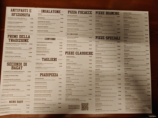 Pizza "bagat" (finferli, speck, formaggio locale) 11 euro: il formaggio locale o se lo sono dimenticati o era mozzarella, finferli vecchi che sapevano di funghi in scatola di un color marrone tendente al nero, ho dovuto rimuoverli dalla pizza per non rischiare di intossicarmi. Lo speck era l'unica cosa lontanamente accettabile, classico speck da supermercato che copriva gli altri sapori (per fortuna). Impasto della pizza mangiabile.