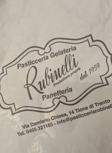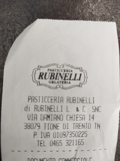 …è da sempre la mia pasticceria preferita!!…fin da quando era stato aperto il primo negozio in Via Perli a Tione!!…e ero una ragazzina!!…e quando uscivo da scuola!!…passavo a prendermi un bignè!!…e precisamente!!…con la panna!!…è la “Pasticceria Rubinelli”!!…con il tempo!!…nel corso degli anni!!…hanno cambiato varie location!!…fino alla sede che si può vedere attualmente!!…di fronte alla stazione delle corriere!!…il negozio ampio e luminoso!!…con vasto assortimento di dolci!!..per tutti i gusti!!…ma anche gelati!!…pane…focacce e pizze!!…un vero punto di riferimento per tutta la valle!!…dolci per ogni ricorrenza!!…dolci tradizionali e per matrimoni!!…confetti!!…bomboniere!!…e tante confezioni regalo!!…di loro produzione!!…ma anche delle migliori marche in commercio!!…ci sono stata tante volte!!…e ho sempre trovato prodotti buoni e di qualità!!…con personale gentile e disponibile!!…anche per un regalino!!…qui si trova sempre qualcosa di carino!!…e non si può uscire!!…senza aver comperato qualcosa!!…che dire!!…pure una super premiata pasticceria!!…con tanti premi e riconoscimenti in Italia e anche all’estero!!…e per me!!…se voglio qualcosa di dolce buono!!…e speciale!!…lo trovo solamente alla “Pasticceria Rubinelli”!!…un nome!!…UNA...