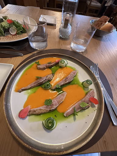 Uiterlijk en sfeer: Het restaurant ademt een ouderwetse, rustieke charme die direct een gevoel van warmte en gezelligheid oproept. Het interieur is stijlvol en zorgvuldig ingericht, waarbij de authenticiteit goed bewaard is gebleven. Opvallend is de uitgebreide wijncollectie die prachtig wordt gepresenteerd, wat meteen de verwachtingen wekt van een serieuze en kwalitatieve keuken. De achtergrondmuziek is subtiel aanwezig en nooit storend; het draagt bij aan de ontspannen sfeer zonder de gesprekken te overheersen.