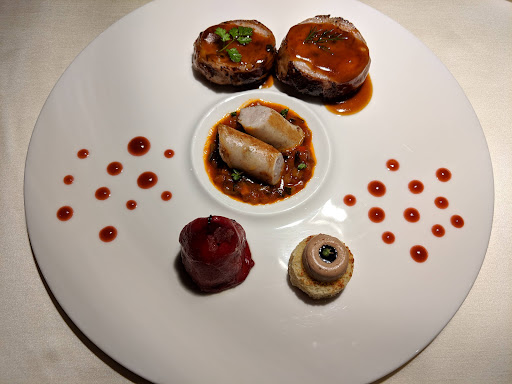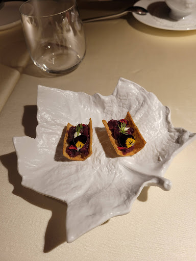 From there, the rest of the meal was fine, but nothing was particularly memorable or outstanding, which I would expect when spending 140 euros per person on the food alone. The salad course with yuzu dressing was fine, but pretty basic. The mortefella tortalini in broth tasted like pasta I could buy in the refridgerated section at the grocery store adn the broth was fine but not memorable. The venision with herb blanket was cooked differently for each person at the table (from rare to medium), so we had to swap plates based on preferences. The pasta was jsut a cacio e pepe but made with cheese broth vs. pasta water, once again fine but not memorable or particularly unique. And then on the dessers, the coffee macaroon held room from improvement on execution (was overcooked in areas, if you're going to make macaroon, you better really know how to make a good macaroon) and the rest of the sweet bites tasted like something that might be served at a nice hotel conference center business lunchon (caramel cream and a hazelnut ice cream I think, not bad per se, just not memorable at all).