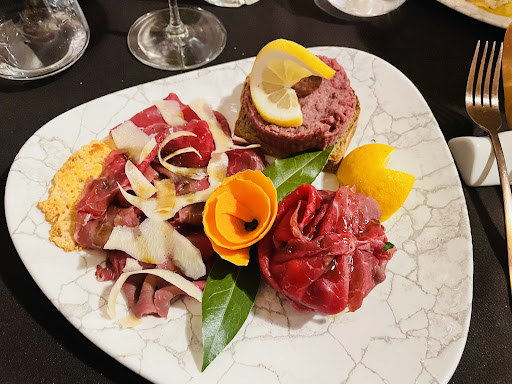 La cena è iniziata con due antipasti eccellenti: un piatto di affettati misti che includeva speck, lardo aromatizzato alle erbe , cacciatorino e lonzino affumicato, accompagnato da un altro antipasto di verdure miste, servite con un crostone e formaggio fuso.
