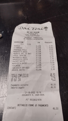 Read moreCapitato per caso la vigilia di Ferragosto, è stata una piacevole sorpresa. È una seconda apertura (dal 2019) di un locale già presente a Thiene, ora dovrebbero aprire anche un panificio. Locale, carino e moderno all'interno, presente anche posto all'esterno, ma l'affaccio è su una strada, interna al Paese, ma comunque frequentata: non si poteva fare altrimenti. Prodotto core i panini Gourmet (peccato le patatine a parte😉), qui a Trissino hanno aggiunto anche le pizze con impasto napoletano. Bordi alti, forse mi aspettavo una pizza meno sottile al centro. Ho preso una (non leggerissima) porcini e salsiccia, mangiata alle 21:30 di sera e ben digerita, quindi direi che l'impasto è molto buono 😉 Dolci buoni anch'essi, particolare il tiramisù, che si presenta come una torta in fetta (come prima impressione può spiazzare), ma nel complesso il gusto è quello della versione tradizionale 👍 Prezzi nella norma per una pizzeria che vuole posizionarsi un po' sopra quelle tradizionali: 50 euro per due pizze (non basiche) birre (in bottiglia), acqua, due dolci, caffè e limoncello offerto. Il cameriere ci ha regalato anche dei biscottini. Giudizio finale: consigliata, anche se viene spontaneo chiedersi, vista l'aggiunta delle pizze, dove si voglia posizionare questo locale rispetto ad un possibile vicino concorrente: Cornedo Vicentino, a ben vedere, è solo...
