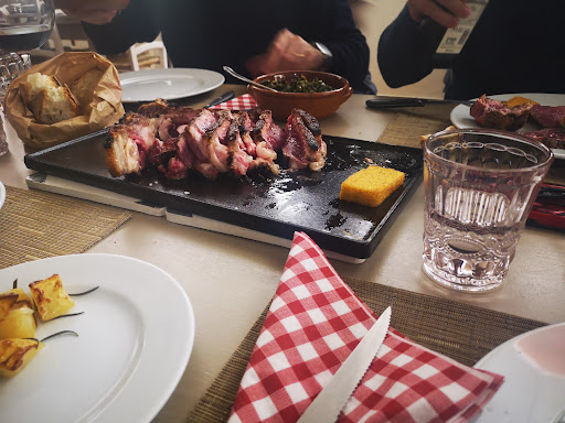 Locale bello nonostante più stili messi insieme. Abbiamo richiesto 3 menu di degustazioni compreso di un antipasto 3 piatti di degustazione di carne, dolce e caffè. Purtroppo e giustamente essendo le 22:00 di sabato sera un piatto di carne era finito, abbiamo richiesto al cameriere che in questo caso era il padrone del locale se era possibile magari aggiungere un pezzo di carne simile così per avere comunque il menu degustazione ma a quanto pare non era possibile. Così il cameriere ha deciso di consigliarci!? O meglio ha deciso lui cosa avremmo dovuto mangiare esattamente costata da 1 kg in tre persone da dividere. Con tanto di risposta” tanto il prezzo era più o meno quello”. Ma forse i conti non li sa fare molto bene.. Peccato che la costata è stata poi divisa con 2 fettine si e no a testa di carne, dato l’enorme eccessività di grasso che sicuramente ci sta ma se non si riesce a mangiare non so che farmene. Abbiamo inoltre chiesto che vino avremmo potuto abbinarci alla costata ed altri piatti simili e al posto di consigliarci ci ha aperto il menu e c’è l’ha letto..cosa che sappiamo fare tutti credo. Dato che avremmo dovuto divide la carne il cameriere ci ha consigliato di prendere anche degli antipasti perchè ci avrebbero impiegato almeno 40 minuti prima dell’arrivo della carne dato che erano un po’ incasinati (ore 22:00). Invece l’antipasto che era semplicemente un tagliere di affettati e il gnocco fritto è arrivato ben dopo 40 minuti. Alla fine abbiamo iniziato a mangiare la carne alle 23:00. Sarà anche sabato sera e avrai anche il locale pieno ma mangiare alle 23:00 dopo un’ora e mezza che aspetto mi sembra davvero un po’ troppo. Appena arrivato il vino stappato mentre era nel cammino della nostra tavola e poi fermatosi a parlare con altri clienti mi sono accorta di avere il bicchiere sporco di un rossetto non mio così ho chiesto di cambiarlo e mi era stato assicurato che sarebbe arrivato subito..ma non l’ho più visto. Quando è stato l’ora del conto dopo aver avvertito di questo disguido alla cassiera gentilissima a venirci incontro con il prezzo, il padrone poi stato chiamato per avvisarlo si è messo a giustificarsi con tanto “vi faccio vedere i pezzi di carne in cella”, per salvare la situazione. Si è messo a dire che c’è la costata grassa e quella magra e quanto la paga lui, cosa che non m’interessa essendo il cliente, poteva semplicemente chiederlo quando ha chiesto la cottura della carne. Peccato perchè la carne sarebbe buona. Forse saremo anche ragazzi giovani ma si ricordi che dopo questo commento negativo le voci girano e sicuramente non è un posto che...