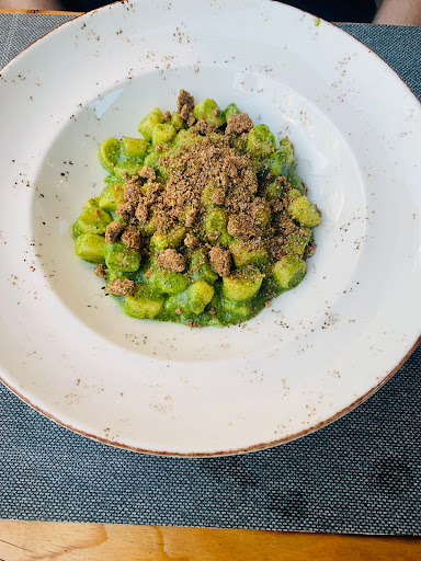 Il locale esteticamente è davvero carino, tutto nuovo (hanno aperto a fine 2019), realizzato in legno e pietra (tutto materiale di recupero del vecchio fienile ristrutturato) e situato in una zona non centralissima di Livigno, quindi meno turistica e più tranquilla. Una volta entrati siamo rimasti super soddisfatti per la bellezza del locale e per la gentilezza e professionalità dei ragazzi della sala. Ci hanno fatto accomodare al tavolo con la scacchiera, dove chi perde, ahimè, paga. Il menù spazia da piatti classici, piatti classici ma rivisitati e piatti un po' piu gourmet. Abbiamo preso due calici di prosecco come benvenuto, e ci è stato portato un benvenuto classico (per me) e uno vegetariano per la mia fidanzata. Il canederlo per me era WOW! buonissimo, me ne sarei mangiati altri 200. Super equilibrato nei sapori e per nulla pesante, per la mia fidanzata è stata portata una crema di piselli con pomodorini secchi, molto fresca e gustosa. Come antipasto io ho preso dei Chisciol con formaggio dell'Alpe Vago, cicorino e salsa francese. Super Super buoni. Come primo piatto abbiamo preso dei pizzoccheri rivisitati e dei ravioli con crema di melanzane. I pizzoccheri rivisitati erano una manata: PESANTISSIMI, ma davvero super gustosi. I ravioli non li ho assaggiati. Ci sono stati portati anche due calici di vini locali. Come dolce abbiamo preso un piatto di bigne con miele locale. Ci sono stati portati anche vari digestivi preparati da loro, BUONISSIMI, uno più fresco e gustoso degli altri.