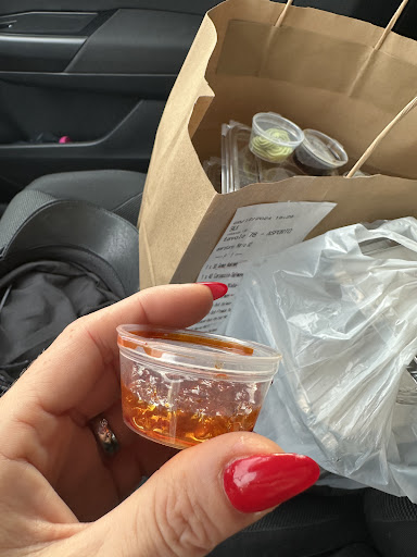 Ho ordinato Cucina da asporto, un box da € 95, sono arrivata alle 13:07 (23 minuti di anticipo) per ordinare una porzione di involtini in più, da lì hanno avviato il mio ordine che avevo fatto la sera prima per le ore 13:30.. Alle 13:45 finalmente il mio cibo è pronto, il proprietario, che fino a quel momento non aveva fatto niente, ha deciso di iniziare a lavorare proprio in quel momento e prende lui i miei sacchetti e prepararmi una salsa piccante (minuscola come si può vedere dalla foto) per tutto l’ordine che ho fatto (22 piatti), al che con tutta innocenza gli domando “ma per tutto questo cibo mi dai solo quella salsa?” E lui in tutta risposta in modo molto sgarbato, si gira dandomi le spalle, per andare a prendere i contenitori, e mi dice “le salse si pagano”… Innanzitutto non ti ho mai chiesto di regalarmele, hai 20 minuti di ritardo, ho ordinato un sacco di cibo e tu mi vuoi dare solo una salsa? Ma che modi sono? Inoltre, ti ho pagato tre Coca-Cola che non mi hai messo neanche nel sacchetto, e hai anche cercato di dare la colpa al personale (ho il messaggio che mi hai scritto in WhatsApp) mentre invece la colpa è solo la tua, proprietario, perché il personale l’Coca-Cola le aveva messe di fianco ai sacchetti, sei tu che, non me le hai date, quando mi hai consegnato i sacchetti.