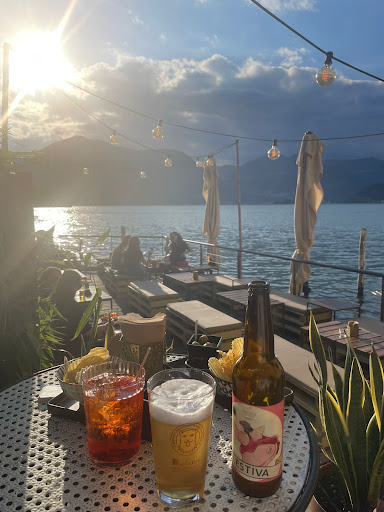 Read moreUna votazione scaturita dalla media di molteplici aspetti. Partendo dal punto di forza: la vista mozzafiato sul lago d’Iseo, su un piccolo pontile in legno a filo d’acqua. L’atmosfera, durante il tramonto, rende l’esperienza unica e romantica, così come all’imbrunire, quando il cielo diventa scuro e si possono apprezzare appieno le coste illuminate prospicienti Sulzano. La musica lounge arricchisce ancor di più questa piacevole location. Sono arrivata con amici al momento dell’aperitivo. I tempi di attesa per l’ordinazione sono stati abbastanza lunghi, nonostante la cameriera addetta a questo ruolo fosse libera, ma intenta a chiacchierare con la sua collega (non avevamo fretta, eravamo lì per rilassarci, ma credo sia giusto farlo presente nelle recensioni). L’aperitivo è scarso, costituito semplicemente da patatine e olive. Eppure il costo non giustifica tale pochezza, poichè ben più alto rispetto ai locali della medesima tipologia. Ci siamo fermati anche per la cena. Nonostante i piatti scelti siano risultati ben eseguiti (fritto misto e tartare di ombrina), non si può dire altrettanto della mis en place: è stato decisamente scomodo pasteggiare su tavolini destinati a un aperitivo, troppo piccoli e bassi rispetto alle sedute. La nota dolente è arrivata al momento del conto: abbiamo riscontrato, ahimè, che ci sono state addebitate per due volte le spese del coperto, in quanto abbiamo sostato sia per l’aperitivo che per la cena, mantenendo tuttavia gli stessi posti. Mah… Un vero peccato sprecare una votazione che sarebbe potuta essere eccellente, per queste pecche. Consiglio di rivedere tutti questi aspetti, marginali ma importanti, per rendere l’esperienza complessiva degna di meritare...