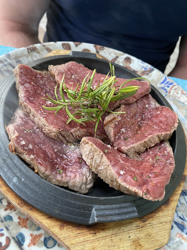 Read moreWir haben Mitte Mai auf der Durchreise zu Abend gegessen und das Rumpsteak bestellt. Zu unserer Überraschung bekamen wir dünne Scheiben von dem wirklich sehr guten Fleisch wie ein Carpacchio angerichtet. Das war zwar anders, als wir es erwartet hatten, aber durchaus sehr lecker. Dazu hatten wir uns gebackene Kartoffeln bestellt, die sich allerdings als gewürfelte gekochte und in der Pfanne leicht angebratene Kartoffeln herausstellen. Das wäre im Grunde nicht weiter schlimm gewesen, wenn diese nicht den Geschmack von vorgekochten und im Kühlschrank mehrere Tage aufbewahrten Kartoffeln gehabt hätten. Das war fast ungenießbar! Der Service war ansonsten freundlich und ok. Wie gesagt, die Fleischqualität war ausgezeichnet. Wegen der Kartoffeln allerdings nur 3 Sterne, sonst wären es 4 statt 5 gewesen, da auch das Ambiente innen schon etwas...