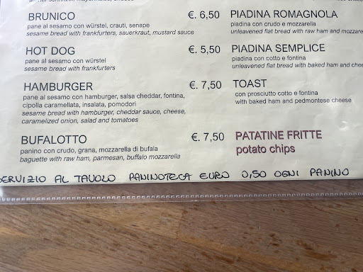 Pessimi! Siamo qui a foppolo a sciare, non avendo trovato posto nelle altre paninoteche siamo arrivati qui. Servizio pessimo, maleducati, lenti. Nel menu appare la scritta “ Servizio al tavolo paninoteca euro 0.50 a panino”, non solo trovo folle che AD OGNI panino venga applicato il sovrapprezzo di 0.50€ ma lo trovo folle quando al tavolo vengono portati 5 panini in un unico piatto, impilati uno sopra l’altro ed il piatto appoggiarlo al bordo del tavolo e mollato lì. Mi chiedo con quale coraggio chiedano i 0,50€ a panino per un servizio che è totalmente inesistente. Il tutto senza mezzo piatto, nemmeno l’ombra di una posata, né di un tovagliolo. Tavolo così, nudo e crudo. Oltretutto cibo scadente e pane raffermo a prezzi folli ! ( 5 panini e un litro di acqua 48€ ) Da evitare assolutamente! Una stella, ...