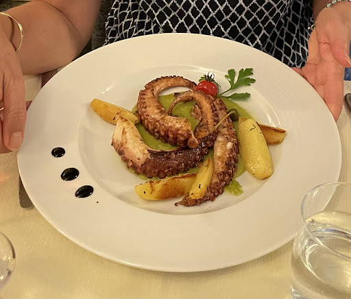We have never been disappointed here. A family favorite. The seafood menu, served Friday and Saturday has great and tasty choices. The portions are just right, not huge but just right. Not leaving this restaurant hungry, but not overstuffed either. The staff is attentive and kind. Our waiter could speak 5 languages… wow! I had the octopus on top of a pea purée and my husband had an herb risotto with a hint of lemon and shrimp kabobs over the top Both dishes simply yummy. The seafood appetizer was perfect for...