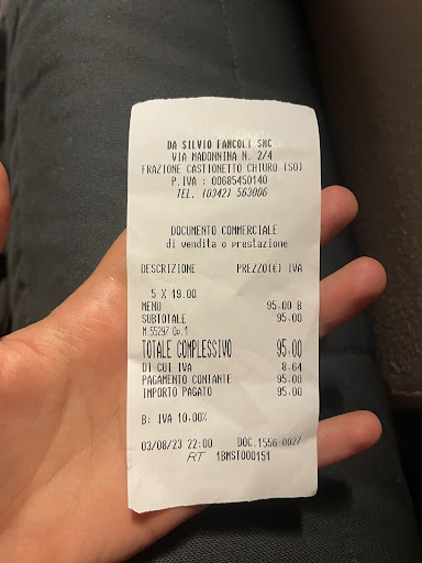 Arrivano gli sciatt: BUONISSIMI! Qua veramente non si può dire nulla, il gusto ha persino superato le altissime aspettative (visti i consigli numerosi e le alte recensioni)! Arrivano anche i primi, in differita tra le varie tipologie di piatto ma anche qui…. Hanno vinto a mani basse! I pizzoccheri erano spaziali, alcuni amici li preferiscono con più verdura ma personalmente mi hanno fatta sognare così com’erano! Davvero il cibo è buonissimo! La sala non era piena e il servizio è stato veloce. Continuiamo però con le note amare…. La signora ci ha trattati male, forse perché siamo giovani, o forse perché non siamo dei locals… così però non si fa. Durante la serata è arrivata anche una coppia francese sulla ventina, e per capirsi c’è stata un’altissima difficoltà. La signora non capiva nulla, il menu non c’era, nessuno capiva niente! Il conto è un mistero tutt’ora irrisolto, e per sempre sarà così! Allego la foto del nostro scontrino perché non avevamo idea dei prezzi dei piatti che stavamo ordinando. Il totale è stato 95,00€; 3 acque + mezzo litro di vino + 4 antipasti e 5 primi — 19€ a testa Prezzo secondo noi che non rispetta i piatti (in positivo)! Il cibo è stato davvero delizioso!!! Concludo il poema facendo i complimenti ai camerieri (gli altri, non la “signora” 😅!) che correvano per la sala come matti. Si sono fatti davvero il mazzo. Il locale era pulito anche se sarebbe più carino se fosse un po’ rinnovato. Il nostro consiglio è quello di levare la signora dalla circolazione e ringiovanire il locale, dando spazio ai giovani!! Oltre, OVVIAMENTE, a rendere disponibili dei menu...