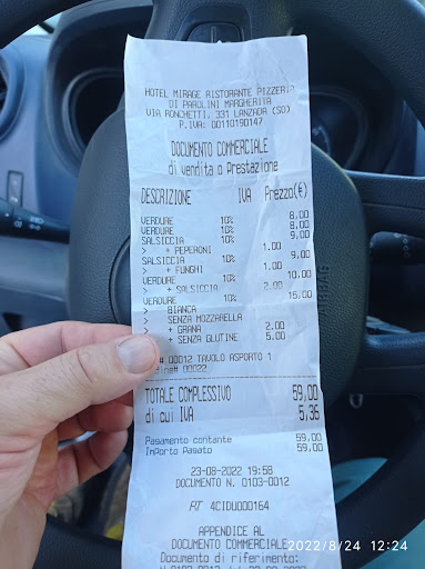Buonasera, sono il marito della signora che non ha gradito la pizza senza glutine... Mi permetto di scriverle pubblicamente perché la sua risposta, come potrà certamente notare dallo scontrino allegato, non è veritiera... La pizza l'ho personalmente pagata 22 euro, 15 per la pizza con verdure( notare che gli altri l'hanno pagata 8 euro),5 per l'assenza di glutine, 2 per il grana... Spero quindi che quando ha affermato di avere lo scontrino in mano con scritto che è costata 8 euro si sia sbagliato e non abbia deliberatamente dichiarato il falso a scopo pubblicitario... Sarà comunque mia premura passare presso il suo locale a farmi rendere la differenza. Le faccio inoltre notare la cortesia di aver aggiunto 2 euro per il grana in più e non aver tolto nulla per la mozzarella ed il pomodoro in meno, aver bilanciato i costi le avrebbe fatto fare una figura migliore. Le rendo noto che in tutta Italia l'impasto senza glutine in genere non costa più di 2 euro oltre l'impasto normale. Ultima ma non inferiore alle altre osservazioni è quella che se l'impasto della sua prelibata pizza gourmet fosse stato buono il sostituire due ingredienti come mozzarella e pomodoro con due ingredienti più pregiati come grana e verdure grigliate avrebbe dovuto migliorare il risultato e non peggiorandolo dicendo che la pizza non sapeva di niente perché non c'era sopra nulla... Sempre fatta salva la qualità degli ingredienti... A Sua disposizione per qualsiasi...