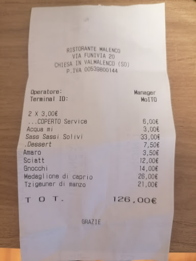 Cibo: assolutamente nulla di eccezionale. Sciatt nella norma, capriolo e zigoiner deludenti. L'unica cosa buona è stata il dolce. Servizio: ho chiesto di sostituire le patatine fritte con un altro contorno, non era possibile. A fine cena lo chef si è messo a fare chiacchiere con un tavolo in cui si parlava di quanto fosse bella la Valmalenco senza milanesi. Noi siamo di Milano e abbiamo trovato la cosa davvero di cattivo gusto. Inoltre ci hanno vietato di portare il cane, sacrosanta la decisione, il locale è loro, ma non è così che si facilita il turismo di chi viaggia con un animale al seguito. Prezzi: 126 euro assolutamente ingiustificati. Il vino che abbiamo scelto e che loro fanno pagare 33 a bottiglia costava 24 al nostro hotel (lo abbiamo scoperto la mattina seguente purtroppo). Non hanno offerto nemmeno 3 euro di amaro. Noi milanesi avremo i nostri difetti, ma in termini di servizio ed educazione forse abbiamo qualcosa da insegnare.