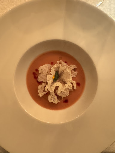 Ci si imbatte in vellutate che ricordano i prunus mume in fiore, senza limitarsi alla bellezza, sono al gusto persistenti e presenti ad ogni cucchiaiata in cui riecheggiano i sentori di barbabietola, cipolla, carote, riso soffiato, salvia.