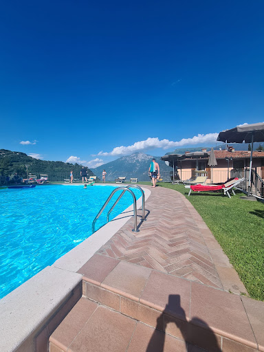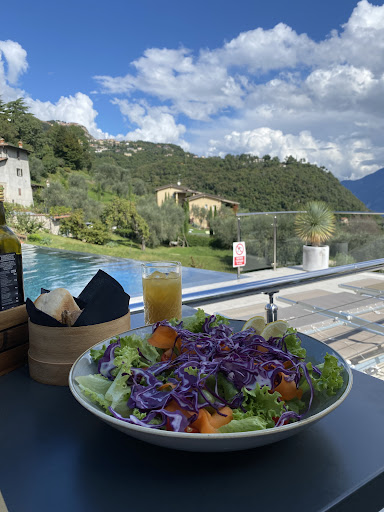 Read moreSiamo arrivate a Tremosine per visitare un altro luogo più blasonato che non nominerò ma, vista la coda per entrare abbiamo cercato un altro posticino. Abbiamo parcheggiato la moto nel parcheggio vicino (con le macchine in parcheggio forse è più difficoltoso soprattutto in alta stagione! ma c'è qualche posto anche proprio sotto al locale). C'è la zona bar con una quindicina di tavolini con una bella vista sul lago e sul monte Baldo e Altissimo. Una graziosa zona verde con dei lettini, accessibile anche per il solo bar e poi c'è la zona piscina nemmeno piccolissima a sfioro e sempre con vista ma con un accesso differenziato e a pagamento. Il cibo sembrava tutto squisito dal menù e propongono anche qualche piatto tipico. Noi abbiamo smezzato una piada perché non avevamo tanta fame ma era ben farcia e appetitosa. Mi toccherà tornare con la fame per provare il resto dei piatti. Camerieri cordiali e sorridenti...