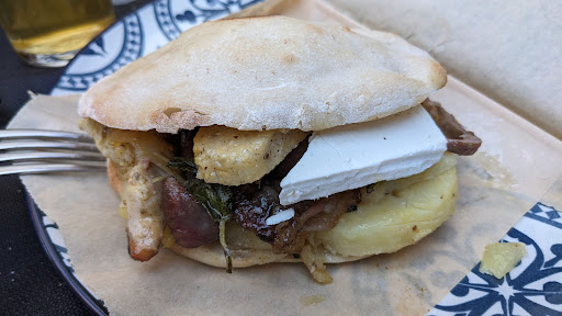 Read moreIndirizzati dall'adiacente albergo, che offriva anche un "fin troppo timido 5% sul conto", ho cenato con famiglia e amici. L'ambiente offre una caratteristica veduta di pochi e ordinati coperti, nel vicolo di fronte all'entrata. Noi però, siamo stati intrattenuti nel cortile interno, dove abbiamo avuto sin da subito, qualche problema di troppo con le formiche sul tavolo. Risolto prontamente spostandoci su un altro limitrofo. IL servizio è stato cortese, informale e nei tempi. Il cibo buono, con sufficienti spiegazioni in merito a curiosità e chiarimenti. I piatti variano da primi, secondi, pizze tradizionali e "quelle lunghe", che mi dicono essere la vera particolarità. Personalmente mi sono lasciato consigliare, come spesso mi capita per cogliere al meglio l'essenza in cui mi trovo, e la scelta "è caduta sul PanSpiedo", presentato come prodotto tipico della cucina bresciana, anche se rivisitato in questo caso come panino. La carne cotta ed irrorata nel burro, si presentava molto grassa, anche per la tipologia dei pezzi scelti. All'interno del pane, il formaggio fuso e pezzi di polenta, completano la "leggerezza consapevole" dell'abbondanza. Aggiungiamo dei triangoli di ricottina salata, omaggiati dallo chef come accompagnamento, che nel mio caso ho gradito integrare, ne fa una portata certamente non per tutti. La visione del burro fuso colare nel piatto sottostante in grandi quantità, lo fa decisamente sconsigliare a chi è attento a calorie, ma soprattutto a deboli di stomaco. Comunque l'esperienza, è un esperienza, e non posso dire che il risultato non fosse gustoso e "opulento". Gli altri commensali hanno prediletto primi di pesce e non (dai 13 ai 16€ circa), oppure carni. La tagliata buona, ma non ha entusiasmato (18€ nella norma). In conclusione, 6 persone, con una portata a testa, acqua e due birre medie, e 5 dolci, poco meno di 140€. Il cibo è buono, il posto è caratteristico e rimane una proposta interessante da provare, anche se personalmente come sopra citato, nulla mi ha particolarmente...