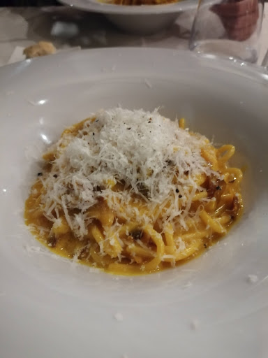 Abbiamo ordinato un antipasto di fiori di zucca ed una carbonara, rimanendo colpiti dal bilanciamento dei sapori nelle pietanze. Particolarmente degne di nota durante la serata sono state la qualità delle materie prime utilizzate per le preparazioni e la rapidità del servizio.