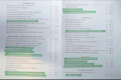 Service: The owner is very nice and speaks multiple languages including English and German. The menu is translated in Italian, French, German, and English for easy reading. I asked the owner why the vegan options are not marked, she said they didn't want the menu to look messy and for people not to order the vegan options because they are afraid of the word. I totally get that and recommended to her that they should create a small menu for vegans separately that people could ask for and easily order from. I really hope they do that!
