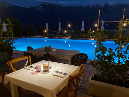 Schöne und entspannte Location, die über Limone thront und beste Blicke auf Monte Baldo, Altissimo & Co sowie Malcesine frei gibt. Es geht ruhig und gelassen zu hier oben und man entgeht sehr angenehm dem ganzen Limone-Trubel. Man speist direkt am Pool in schönem Ambiente und genießt besagten Blick auf die andere See-Seite.