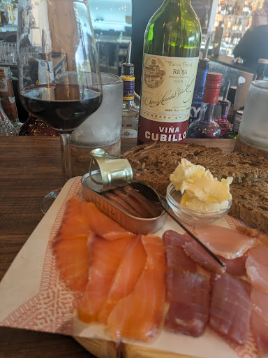 Il locale si presenta molto dinamico e con una vasta scelta di vini, essendo un wine bar, che propone un accompagnamento di taglieri disponibili in due misure ( L e XL). Propone taglieri di salumi, formaggi e assaggi di pesce, in accompagnamento a prodotti “locali” e “fatti in casa”. Premetto che ho messo le virgolette perché non ho potuto accertare che i prodotti rispettassero tali descrizioni, affidandomi solo a quello che mi era stato proposto dal personale. Il menu descrive tutti i componenti, divisi per categorie, che possiamo trovare sul piatto. In verticale sul lato scritto in piccolo troviamo anche la descrizione di quello che troveremo in accompagnamento ( burro per il pesce, marmellate “maison” e miele per i formaggi e infine sottaceti “maison” per i salumi) Su una quarta pagina possiamo trovare anche degli elementi che possiamo aggiungere ai taglieri, ma di questi non ve ne posso parlare perché non ho prestato attenzione a quella pagina. Infine troviamo appunto la pagina che racchiude le proposte suddivise per misura e tipologia, con i relativi prezzi. Non sapendo le misure dei vari taglieri ci siamo fatti consigliare, eravamo in tre, tutti adulti e volevamo cenare, non fare un semplice aperitivo pre - cena. Ci viene consigliato il tagliere misto XL, che comprende una selezione di salumi e formaggi. (30€) In più decidiamo di prendere un tagliere L di pesce (16€)