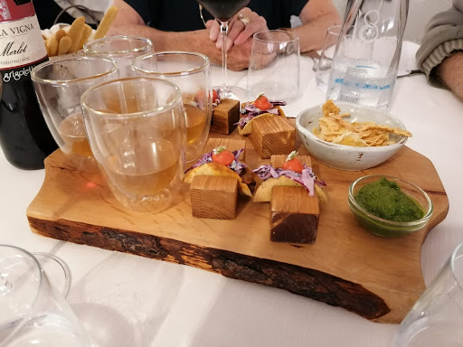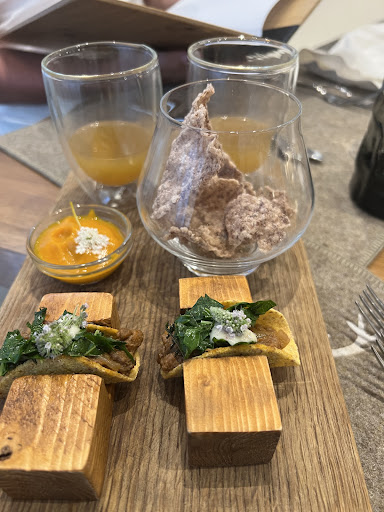 Read moreSituato nel bellissimo centro storico di Predazzo, tra i più bei palazzi del seicento che ne costituiscono il nucleo originale, il ristorante ha sede nella antica macelleria. I locali, elegantemente ristrutturati, sono quindi di per sé una curiosa attrattiva. Ci viene servito subito un leggero piatto di benvenuto gustoso e originale, accompagnato da un brodo allo zenzero che ben dispone alle pietanze che seguiranno. Il tagliere di salumi e formaggi come antipasto è squisito, come i fagottini di cervo e gli spaghetti al burro con ceviche di salmerino gustati come primo. Pezzo forte della casa, ovviamente, i secondi di carne. Tra quelli provati segnalo la tagliata e la braciola panata al cumino, mentre ho trovato il filetto di maiale un po’ troppo asciutto. Dato che oltre non si può andare ci vengono in aiuto i “micro” dessert, contenuti (ma nemmeno tanto) nelle quantità. Notevoli i due sorbetti. A completamento, ottima possibilità di scelta per i vini e personale gentilissimo e disponibile. Prezzi ragionevoli comparati alla qualità. Date anche un’occhiata ai quadri, di notevole fattura, esposti alle pareti. Serata piacevole...