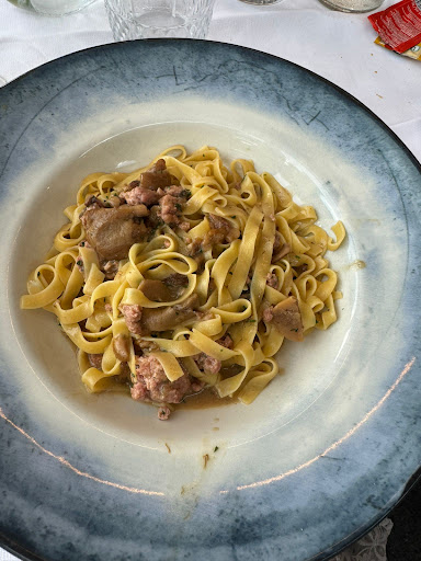 Pasta con salsiccia e porcini con porcini congelati al 100%, con quel sapore di gambo congelato da voltastomaco.