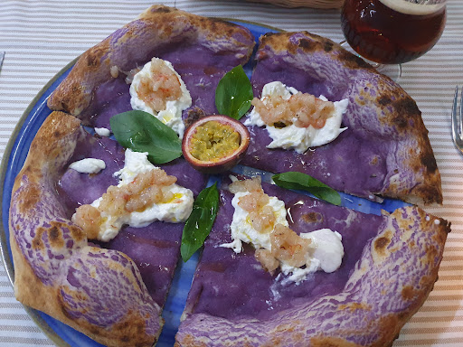 Le bevande da scegliere sono tra le più svariate, e la selezione di birre non è enorme ma curata, da mangiare si può scegliere Pizza o Menù classico, quasi tutti abbiamo preso la pizza, che dire pizze con impasto contemporaneo buone, con ricette fantasiose e audaci come quella che ho ordinato io, l'Afrodisiaca con crema di patate viola, burrata stracciata a mano, tartare di gamberetti, frutto della passione, olio e basilico, dal sapore davvero fresco e delicato. Inoltre alcune pizze qui sono speciali, hanno il cornicione ripieno di una crema a tema con gli ingredienti della pizza! INCREDIBILE!