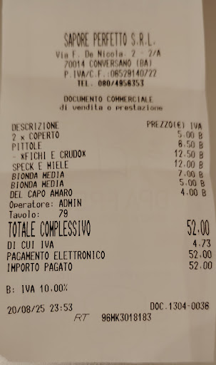 CONCLUSIONE: nonostante l'impegno dello staff mi spiace davvero affermarlo, ma la pizzeria "Sapore Perfetto" di perfetto ha solo l'apparenza. In aggiunta visti i prezzi proposti che non rispecchiano la qualità descritta, mangiare con questo risultato ti fa sentire sempre un po'...raggirato. Al contrario invece se si mangia bene, pagare anche qualcosa in più non...