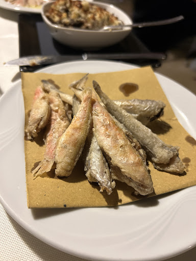 Abbiamo iniziato con una frittura di alici davvero spettacolare: croccante, dorata, asciutta… semplicemente perfetta! I tagliolini con crema di gorgonzola, carciofi, pesto e gamberi sono stati una vera rivelazione: cremosi, bilanciati e ricchissimi di gusto.La pasta è fatta da loro .. eccezionale! La frittura di pesce ha confermato l’eccellenza della cucina: pesce fresco, impanatura leggera, croccantezza impeccabile.