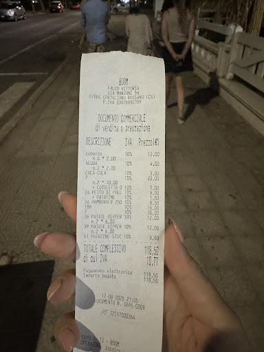 Mia figlia voleva andare a tutti i costi da BOOM per mangiare il panino e Siamo andati in una domenica sera molto tranquilla, circa 3 tavoli occupati. Ci vengono dati dei menù messi male e che emanavano un cattivo odore (anche gli altri clienti degli altri tavoli hanno notato la stessa cosa). Dopo aver scelto ognuno il suo panino arriva la cameriera per l ordinazione e quasi tutto quello che sceglievamo era non disponibile, anche le bibite, la scusa è stata che si stanno per spostare al mare, ci può anche stare ma dirlo prima sarebbe stato più garbato in modo di cambiare locale o non perdere tempo a scegliere panini che non si potevano avere. Alla fine scegliamo i panini, mia figlia panino con cotoletta di pollo, unica cosa che mangiava. Dopo qualche minuto torna la cameriera e ci informa che la cotoletta di pollo non c'era ed era disponibile solo di vitello o di tacchino, scegliamo tacchino. Arrivano le bibite e beviamo Nell attesa dei panini. Dopo circa una mezz'oretta, ritorna per l ennesima volta la cameriera informandoci che i nostri panini erano quasi pronti ma la cotoletta di tacchino non c'era più quindi a forza vitello, gli abbiamo detto che non la mangiava e quindi come unica alternativa mia figlia chiede delle patatine con la buccia. A saperlo prima non avremmo fatto fare nemmeno i nostri panini e saremmo andati via pagando solo coperto e bibite visto che come detto prima mia figlia voleva cotoletta di pollo. Arrivano le patatine e sorpresa non sono quelle con la buccia ma delle classiche patatine a stick. Va bene è affamata e le mangia. Arrivano anche il mio panino e quello di mia moglie. Quello di mia moglie è ok tutto giusto, nel mio invece no, all interno vi era del bacon che non c'era da menù, c'erano delle palline fritte tipo arancini e una specie di nuggets e non c'era il pulled pork, pensavo di essermi confuso io visto l assenza di molti prodotti. Negli hamburger presenza di ossicina, una addirittura molto grande e pensavo di essermi rotto un dente. Lo mangio e tutto sommato male non era, ma non era quello che volevo. Finiamo di mangiare, vado a pagare e chiede giusto a titolo informativo se anche il pulled pork fosse finito e avessero messo il bacon al suo posto, la signora alla cassa mi risponde in modo un po' infastidito dicendomi che il bacon fosse il pulled pork, gli dico che è tutt'altra cosa e chiama lo chef, che in modo garbato mi dice che il pulled pork fosse quella pallina stile nuggets e io gli ho risposto che mi aspettavo il pulled pork come scritto nel menù e non trovarmi una pallina di carne fritta, ringrazio e pago. Quando vado via guardo lo scontrino e mi accorgo che tutte le cose prese avevano aumenti tra i 50 centesimi e l euro un più rispetto ai prezzi del menù. Esempio la birra da menù 2.50 da scontrino 3 euro, panino mia moglie 9 euro da scontrino 10, il mio da menù 13 da scontrino 14, patatine da menù 2.50 da scontrino 3 euro e così via. Purtroppo non ritornerò più in questo locale, mi dispiace ma ero entrato con aspettative alte.