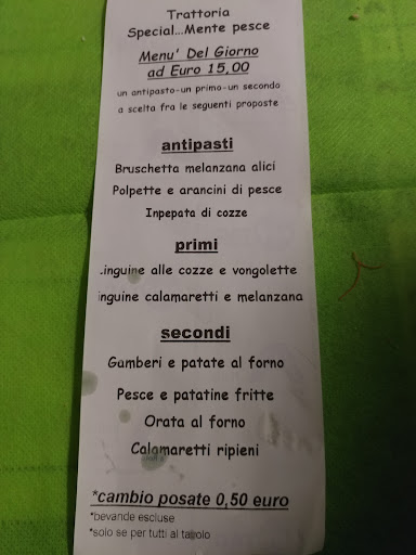 Read moreNon avrei mai trovato questa trattoria se nn grazie all'amico Gianluigi che me lha consigliata caldamente. Beh aveva ragione, ho trovato qualità della materia prima, ottimi sapori, personale disponibile. Ho preso: crostini alici e sardelle, parmigiana di pesce spada, pesce spada olio e capperi. 1 bottiglia di acqua, dolce e amaro.. Solo 25€...ottimamente spesi... Nn ci credevo: Nella mia città per dei piatti del genere, sicuramente meno freschi avrei speso molto di più... Il titolare che ringrazio per la compagnia è una bella persona che sa cucinare davvero bene. Se passo nuovamente in zona ci...