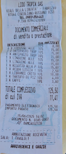 Read moreAbbiamo richiesto un antipasto tropix per due e un piatto di linguine alle vongole per la bambina, da servire insieme, come primo altre due linguine e un risotto alla pescatore. Dopo circa 15 minuti ci hanno servito l'antipasto composto al centro di un' insalata di polipo, intorno 1 acciuga marinata e una fritta, un quadretto di pesce spada marinato , 2 gamberetti in salsa cocktail e una bruschettina, niente di speciale. Il piatto di linguine che la bimba avrebbe dovuto mangiare è rimasto intatto, di solito ne va pazza per questo piatto quindi lo abbiamo assaggiato, e non sapeva di nulla anzi aveva uno strano gusto, ci siamo rivolti al primo cameriere per disdire gli altri 2 piatti di linguine perché se hanno lo stesso sapore non le mangiamo. Purtroppo sono in cottura, ci dice, "se non vi piacciono potete lasciarle". E così abbiamo fatto, erano senza nessun sapore. Per concludere ci chiedono " possiamo offrirvi un caffè o un amaro, prendiamo un caffè Al conto troviamo i caffè che ci avevano offerto e le linguine che abbiamo restituito intatte. Giudicate voi Totale...