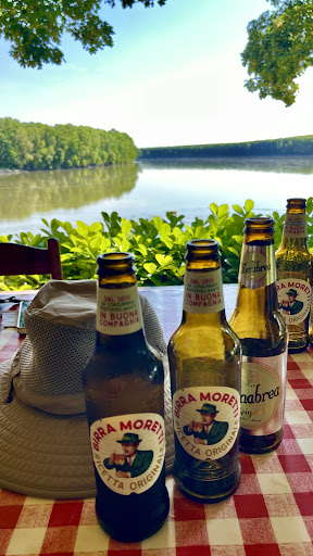 Un bar trattoria situato sopra la sponda del Po' con piccolo attracco per le barche... Ampio parcheggio sterrato,una bella veranda con vista fiume dove si può pranzare o solo sedersi a bere un aperitivo rilassandosi guardando lo scorrere del fiume... Ci siamo fermati dopo un moto giro,Il proprietario molto simpatico e gentile,pur non avendo prenotato è riuscito a farci accomodare per poter pranzare. Pranzo molto semplice che consisteva in un piatto di salumi (coppa, salame, pancetta) un po' di sottaceti...nulla di eccezionale(al tavolo eravamo tre salumieri su 5 commensali)un piatto di tagliatelle al ragù discretamente buono,polenta fritta con pesciolini Top e una fetta di gorgonzola...il tutto accompagnato da due caraffe di bianco frizzante veramente piacevole (10 euro a caraffa)due commensali hanno preso due fettine di crostata alla prugna e uno coppetta di gelato per concludere 5 caffè...beh .. diciamo che 30 euro a testa forse è un po' esagerato... Cmq la location è rilassante,la figlia del proprietario che serve ai tavoli carina e molto gentile,il proprietario altrettanto gentile al pagamento ha offerto l'ammazza caffè e poi volendo c'è dello spazio verde interno dove i bambini si possono svagare.... probabilmente ci torneremo magari quando verrà...