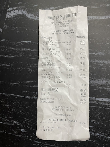 Mi spiace ma sconsiglio vivamente a tutti di passare anche solo davanti a questo “ Ristorante” se così si può chiamare, Eravamo in sette persone dove abbiamo preso tre taglieri con dello gnocco da dividere nulla di eccezionale salumi probabilmente provenienti dalla metro(In quanto appesi aveva una coppa e un salame con l’etichetta ancora metro) Gnocco fritto quasi sicuramente Congelato. Dopodiché abbiamo preso sempre tre risotti da dividere salsiccia e vino forse unica unica nota positiva mangiabile e cotto giusto Ma adesso Arriva il bello abbiamo preso tutti un secondo a testa tra cui tre costate che a menù erano a 20 € ma sullo scontrino finale le costate le ha fatte pagare 28 € a costata( Allego foto scontrino e menù). Due bottiglie di vino cinque acque e un caffè per un totale di euro 47,50 a testa uno sproposito Sia per il posto che per la Qualità del cibo La carne sia della costata che della tagliata risultava molto grassa e in alcuni punti Non commestibile, Tra l’altro avevamo richiesto cottura al sangue ma erano medio cotte(Abbiamo dovuto anche cambiare l’ordine in corso di itinere perché inizialmente le costate erano quattro ma ne erano avanzate solo tre a saperlo gliele lasciavamo volentieri) Non siamo voluti entrare a fare discussioni perché siamo certi che in un posto così non ci torneremo mai mai più Quindi oltre il danno la beffa abbiamo pagato 24 € in più. Tirando le conclusioni non consiglio per nessuno Aspetto...