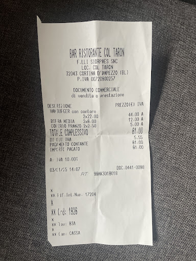 I’m Italian and I really love to visit all our beautiful place in my country, meanwhile in the winter season to ski. Unfortunately sometimes is possible to find terrible place like this with where service and food are terrible… and the count as well. We were 2 people, we order hamburger and fries an and 2 beers: the total 61 euros. The plate was terrible: 1 hamburger and a bit of fries. A poor plate with normal food. The service… horrible. If you don’t like your job you can switch! The guy who took the orders was very bad in his job: hello can we order? For 3 times he replied: not now! With a terrible mood. My friend change your job. The other guy who didn’t take the orders was very kind and yes, he has to take the orders and talk with clients! My experience here was nasty. DON’T GO THERE TURISTS: It’s full of amazing and...