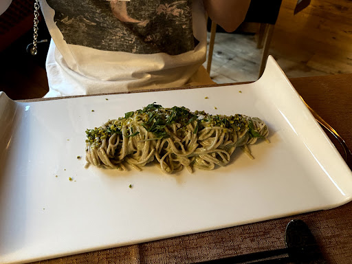 The food was great. Every dish was carefully design in a nice looking plate. You can go classic Japanese food but they also offer more original choices. I started with the Soft Egg (with morlacco cheese and black truffle, excellent. If the chef is reading this I would say it was a bit too salty, but very fine other than this. I then had the Raw of Scampi and Porcini Mushroom which was also delicious. Then the Soba Noodle, the flavors of this dish were amazing, I especially liked the โessence of firโ โ well played. We finished with the Tiramisu Breakdown that has nothing to do with a tiramisu but was nonetheless amazing.