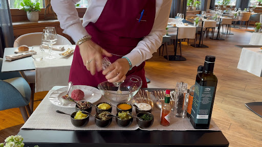 The menu offers a wide range of tempting dishes, combining traditional Italian recipes with creative twists and high-quality ingredients. Choosing was genuinely difficult because everything looked so good. I started with a beef tartare prepared tableside, paired with a touch of burrata stracciatella — delicious, fresh, and perfectly balanced. You can season it to your taste, and the creaminess of the burrata works beautifully with the beef and any spices you choose to add.