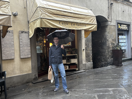 Read moreAprès une gentille pérégrination dans Cortona, en quête d'un coin d'ombre où reposer nos carcasses suintantes, nous avons fini par nous poser en terrasse d'un petit café qui venait d'ouvrir. C'est au Caffé la Saletta (traduction : la petite salle ?!) que nous avons commandé un café et au ice tea pêche. La petite serveuse, au demeurant sympathique, nous a donc amené un café... et un thé au citron, local, affirmant que c'était super bon. Interdits face au fait accompli, nous avons accepté la proposition et, ma fois, la boisson fraîche était bonne. En allant me repoudrer le nez, j'ai apprécié la joliesse de l'endroit : bien tenu, propre, "cosy" (je n'aime pas trop cet anglicisme, mais faute de mieux). En passant à devant la caisse, je suis allé payer mon dû : 2€ + 4€ = suspens... 6€. Aussi, en partant, je n'ai pu retenir une petite expression que nous avons, dans le sud (de la France):...