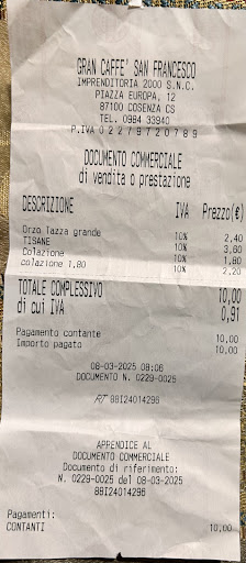 Read moreUscendo dal laboratorio di analisi adiacente al bar S.Francesco di piazza Europa a Cosenza , entriamo x la colazione con mia moglie ordinando 1 orzo macchiato in tazza grande (intendo quella del cappuccino ), 1 treccina mini ai frutti di bosco 1 croissant vuoto, 1 tè filtro deteinato della star servito con la teiera con acqua tiepida non bollente , insieme con 2 biscotti al burro non richiesti , fin qua tutto normale niente di eccezionale che facesse pensare ad una sorpresa finale .. infatti al momento di pagare mi viene staccato uno scontrino pari a €10.00 che allego . rimango davvero senza parole , non li ho spesi neanche a Venezia in piazza S.Marco o a Portofino o ad Ischia ordinando le stesse cose x ns abitudine , davvero ritengo assolutamente esagerato non giustificato !!!! , non credo c ritorneremo...