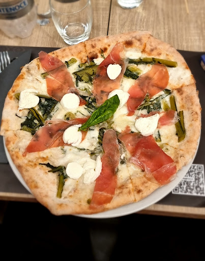 La pizza è sottile, con un impasto morbido – ci aspettavamo qualcosa di più croccante, ma nel complesso è risultata piacevole. Ingredienti nella media, senza particolari guizzi, ma ben equilibrati. Molto carina l’idea dell’ostia personalizzata con il logo del locale sulla pizza, un piccolo tocco distintivo.
